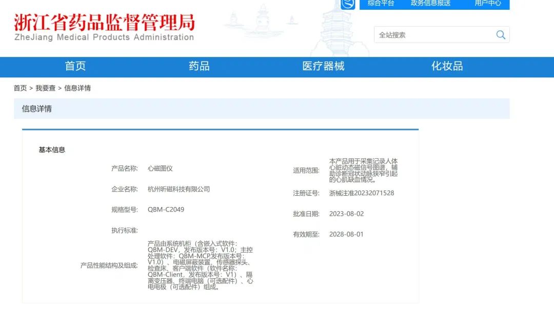 重大喜讯!2023年8月2日,昕磁科技的心磁图仪(QMB-C2049)获得浙江省药品监督管理局医疗器械注册批准